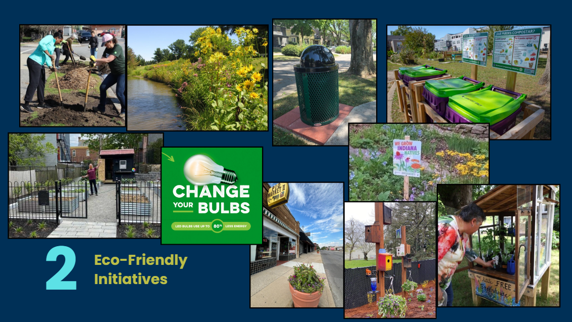 - Eco-Friendly Improvement Projects –include vacant lot adoption/clean up, community food gardens, pollinator gardens, heat reduction through tree planting, native plants, rain gardens, community hanging flower baskets or planters, waste/recycling receptacles, composting sites, community birdhouses, wildlife/native habitat restoration, shoreline restoration, light bulb replacement program, and little free plant library/ seed sharing/ community greenhouse.