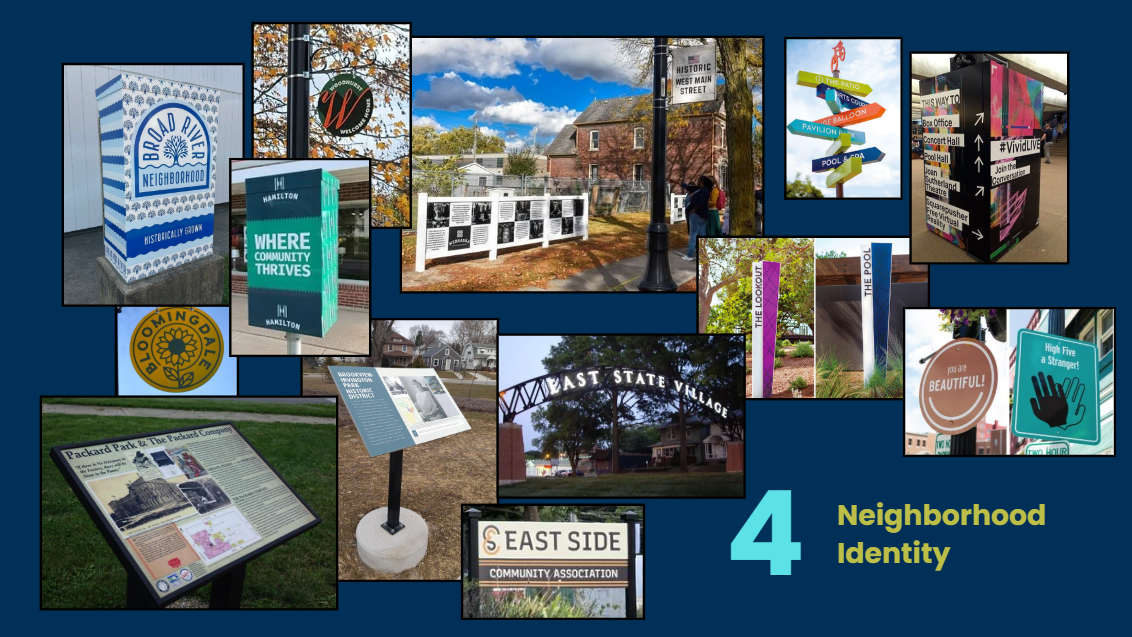 - Neighborhood Identity Projects– logo/branded signage, wayfinding signage, communication bulletins, historic district signage and plaques, historic landmark signage, neighborhood storytelling signage.