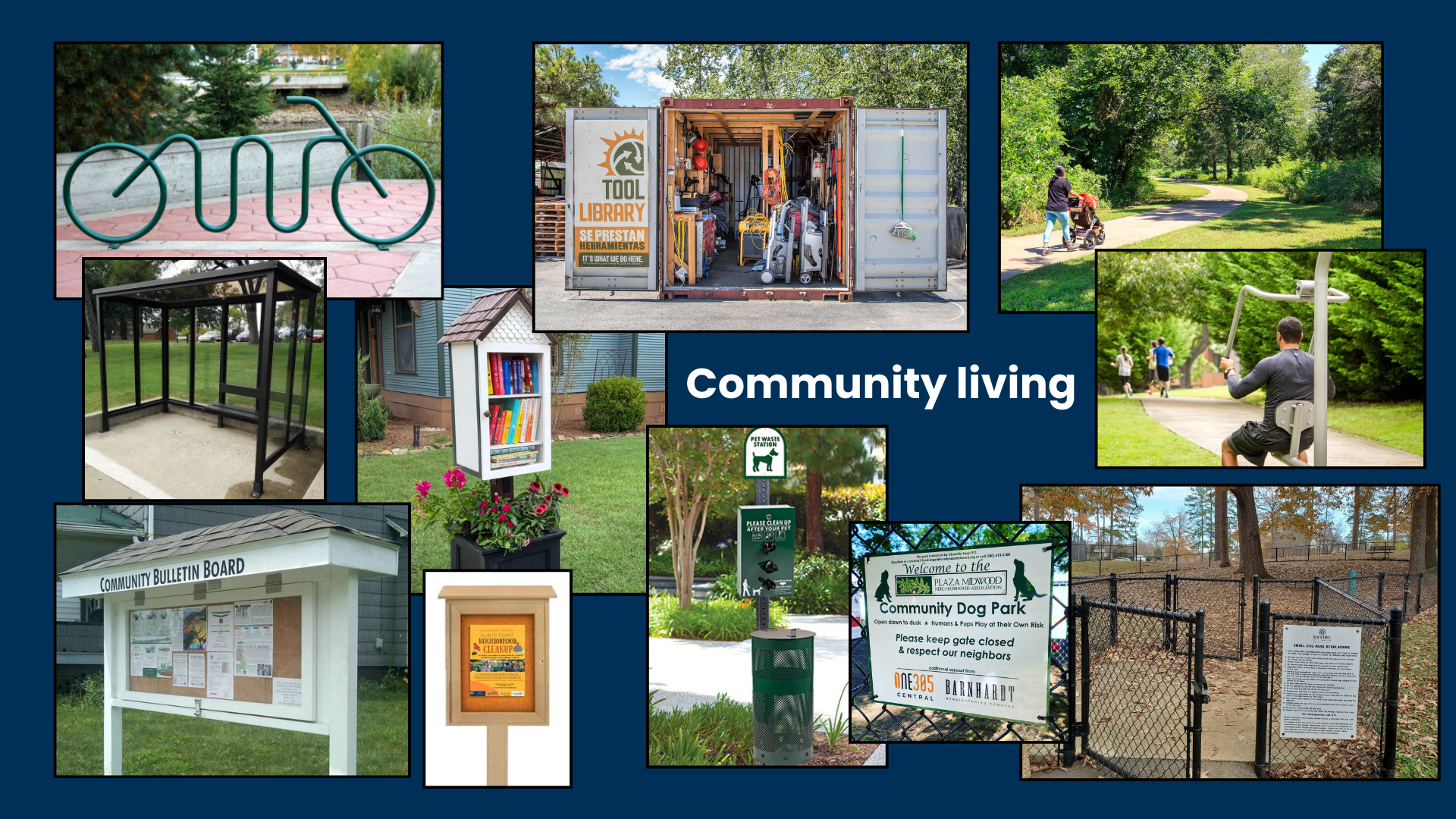 - Community Living Improvement Projects– include playscapes, athletics/ physical activities spaces, alternative transportation access improvements, dog park/equipment, improved gathering spaces, benches/picnic tables/pergolas/pavilions, share shed/ lending library, safety/ lighting improvements, path and/or trail improvements, and curb appeal microgrants.