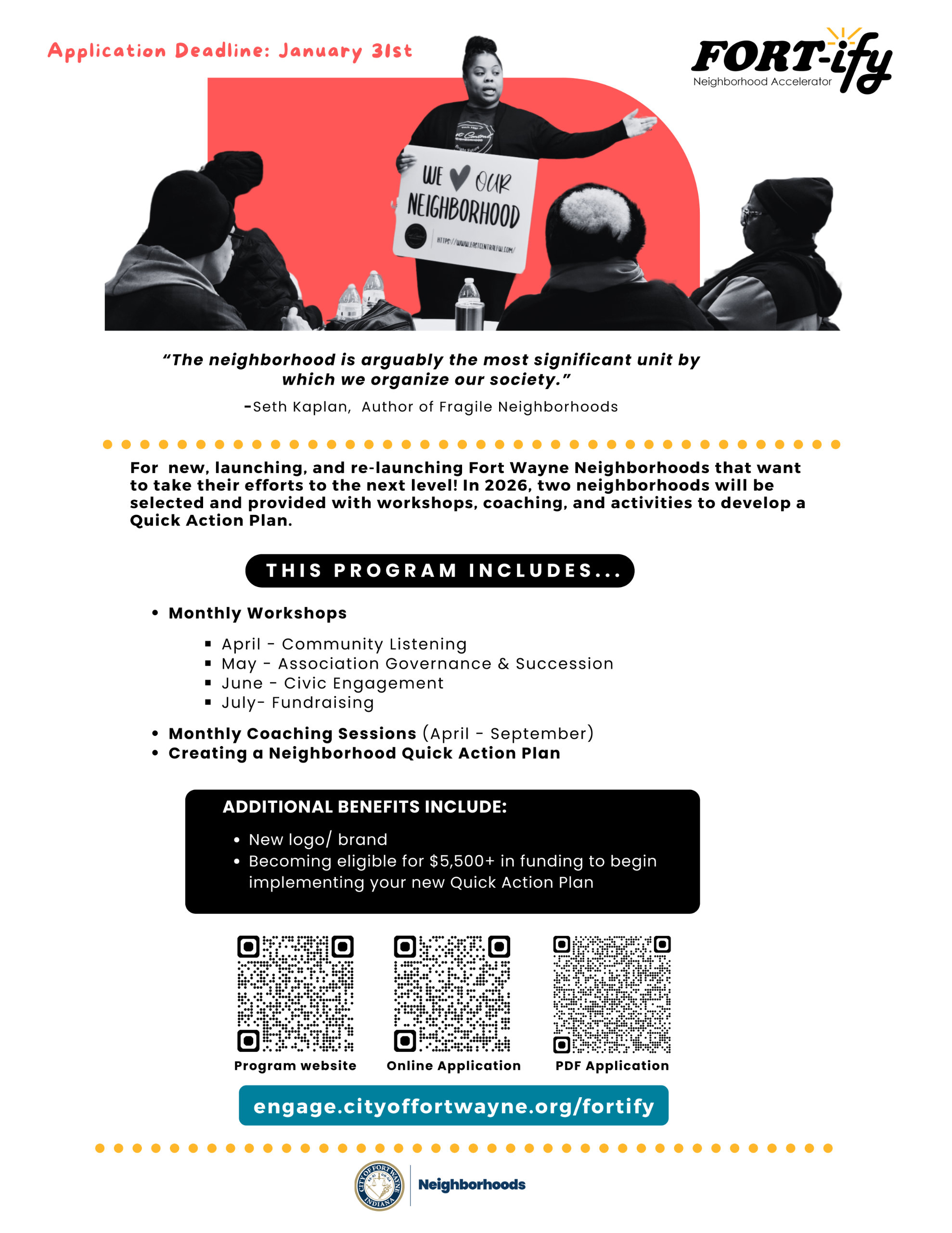 The FORT-ify Neighborhood Accelerator is designed for neighborhood association leaders who want to take their efforts to the next level! FORT-ify participants will take part in monthly in-person workshops, work with city staff to develop a Quick Action Plan (QAP), and complete hands-on activities between workshop sessions to put what they’re learning into practice in their neighborhoods.