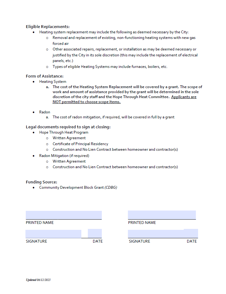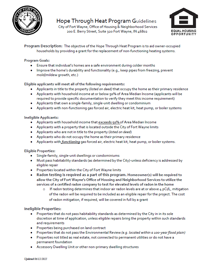 The objective of the Hope Through Heat Program is to aid owner-occupied households by providing a grant for the replacement of non-functioning heating systems.