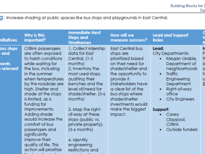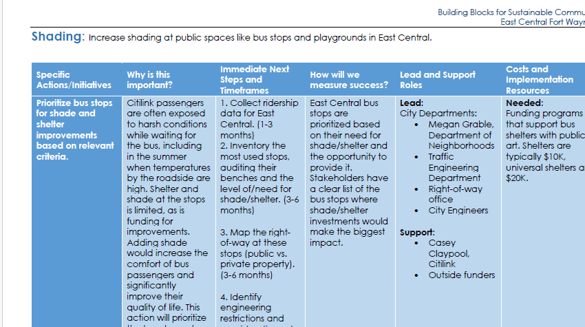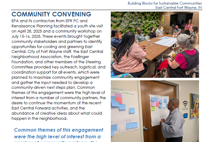 The Building Blocks for Sustainable Communities, in partnership with the Environmental Protection Agency, is providing planning assistance to the Department of Neighborhoods and the East Central Neighborhood to address extreme heat in East Central. The Jennings Center, Indiana Tech, and the Foellinger Foundation have also partnered in the project.