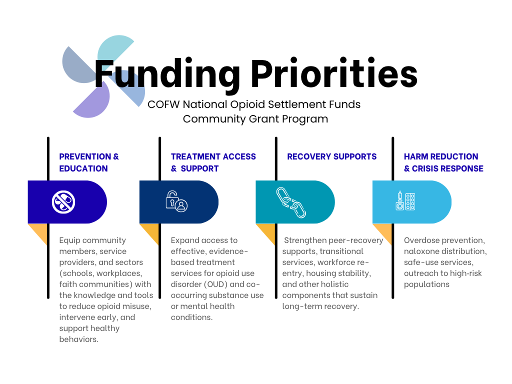 - The COFW National Opioid Settlement Committee will meet monthly to review funding strategies, approve funding recommendations, monitor progress, and facilitate community input.