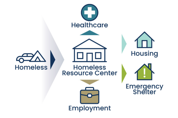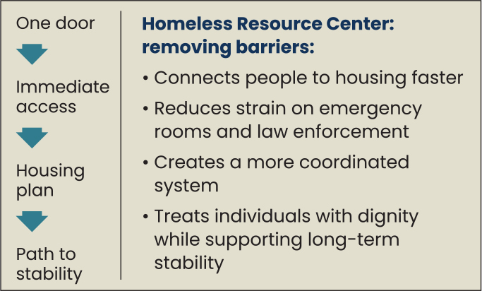 The Homeless Resource Center is a 24/7 front door to housing and stability. It’s a low-barrier hub where individuals experiencing homelessness can access basic needs and get connected to housing and support services – immediately and all in one place.