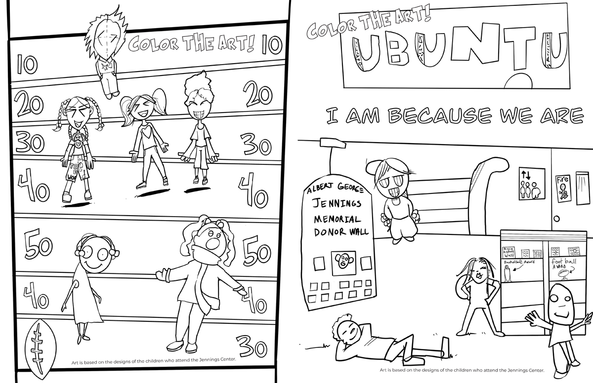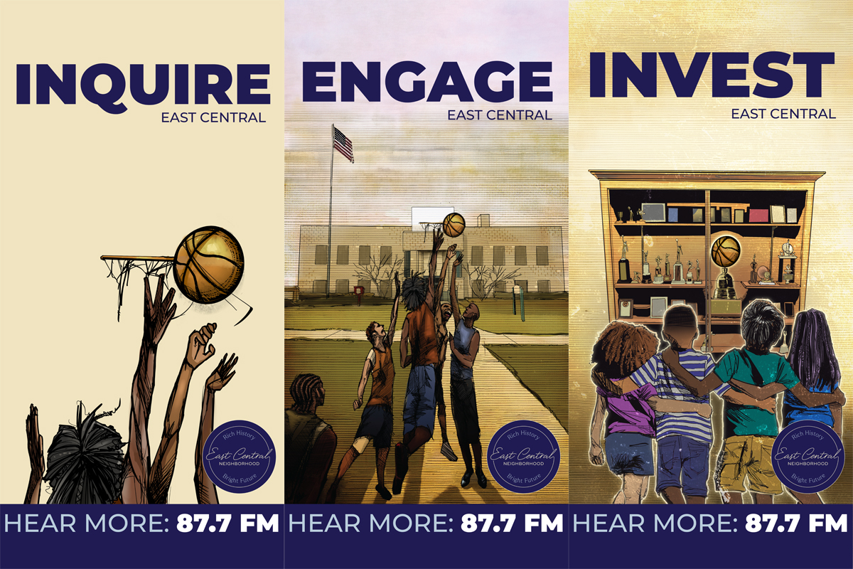 Artist Brandon Coley, having collaborated with the East Central neighborhood, drew a series of a narrative street banners that will be installed around three hubs of the area: The Jennings Center, Hanna Homestead Park, and the African/African-American Historical Society & Museum.