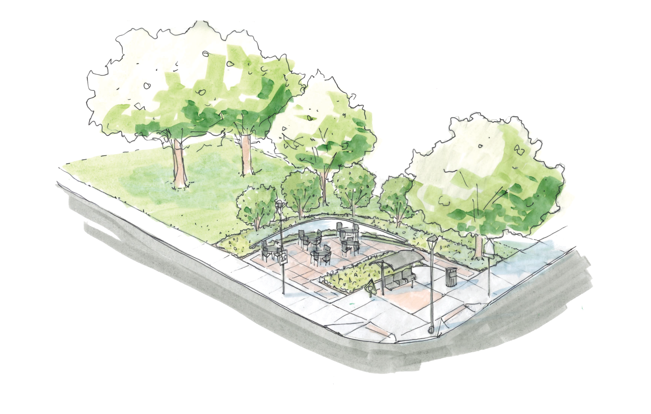 - Plaza with tables and chairs for outdoor dining